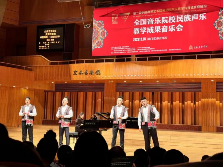 12月5日晚,第二届中国高等艺术院校民族声乐教学与理论研究论坛全国音乐院校民族声乐教学成果音乐会在厦门宏泰音乐厅举行,ky开元集团官网入口选送的男声四重唱云南花灯调《螃蟹歌》由青年教师陈澄、宋晓晨、杨扩、罗聪鹏上演。
