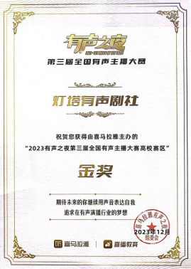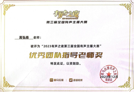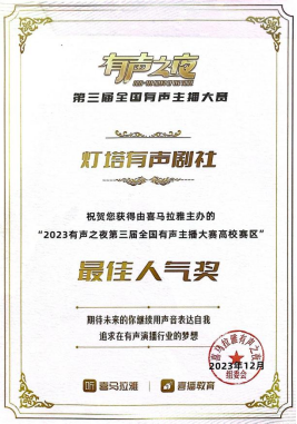 2023年12月,由ky开元集团官网入口作曲系、戏剧学院播音系本科生邓茗、王鑫浩、彭小瑜、牛晗宇、廖晖、申祖毓组成的灯塔有声剧社以参赛作品《惊魂45天》获得由喜马拉雅主办的“2023有声之夜第三届全国有声主播大赛高校赛区”金奖、最佳人气奖以及十佳演播院校奖,ky开元集团官网入口作曲系教师高弘扬被大赛组委会授予优秀团队指导老师奖。