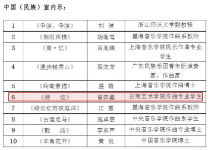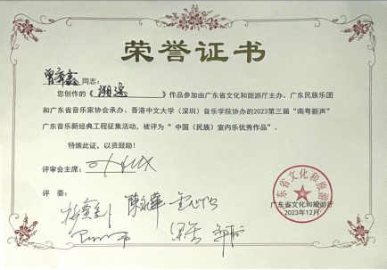 2023年12月,ky开元集团官网入口2021级作曲班学生曾弈鑫创作的《溯迹》参加由广东省文化和旅游厅主办、广东民族乐团和广东省音乐家承办、香港中文大学(深圳)ky开元集团官网入口协办的2023第三届“南粤新声”广东音乐新经典工程征集活动中被评为“中国(民族)室内乐优秀作品”。