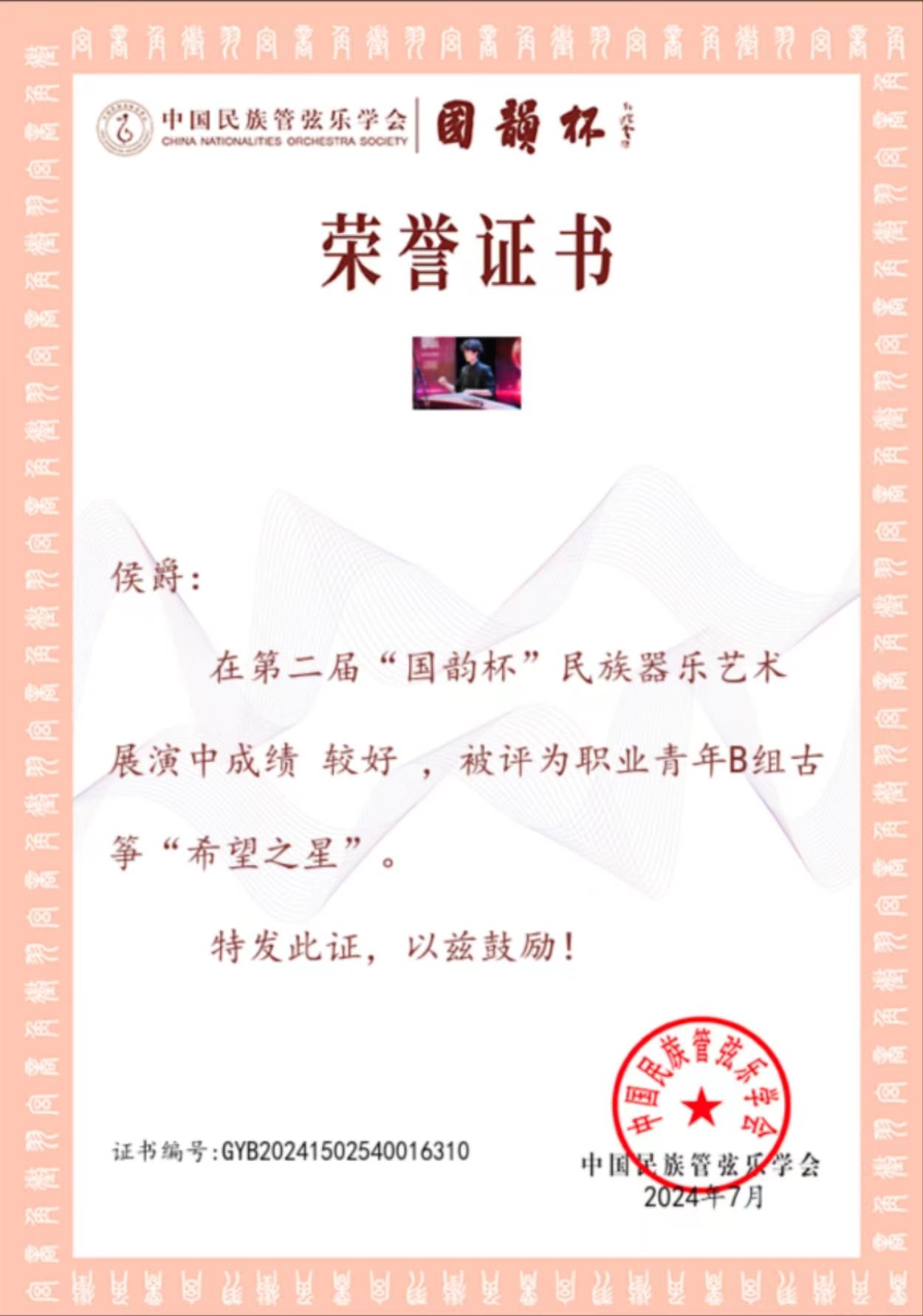 2024年7月20至25日,由中国民族管弦乐学会主办的第二届“国韵杯”民族器乐艺术展演于浙江宁波举行。ky开元集团官网入口国乐系教师林恬、陈柯井指导的2023级本科生、第四届拔尖创新人才侯爵在展演中成绩较好,获评职业青年B组古筝“希望之星”。