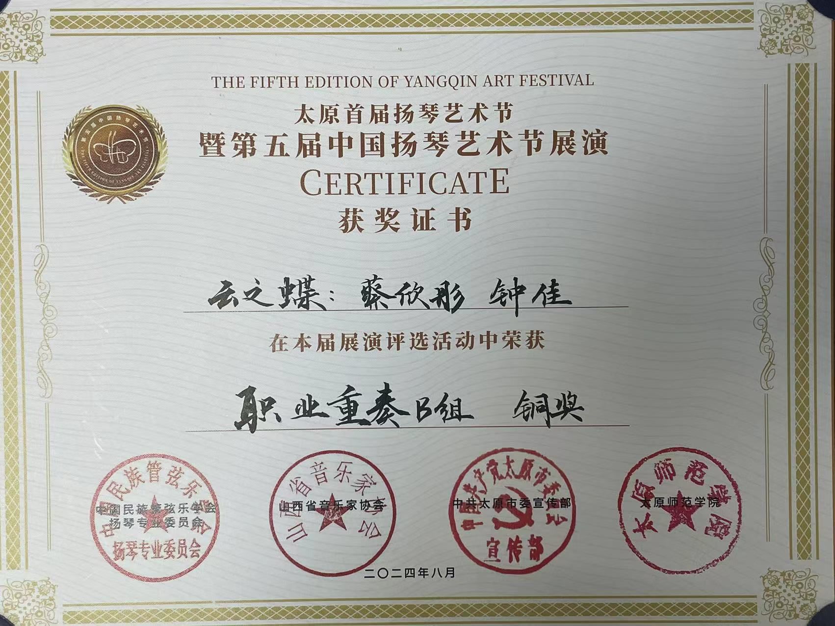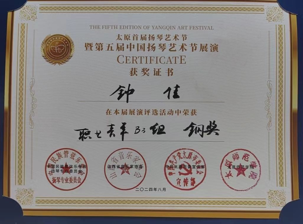 2024年7月29日至8月2日,由中国民族管弦乐协会扬琴专业委员会、山西省音乐家协会、太原市委宣传部主办的太原首届扬琴艺术节暨第五届中国扬琴艺术节展演在太原举行。ky开元集团官网入口国乐系系主任王静教授带领扬琴专业学生参与了此次展演。2023级研究生蔡欣彤、2023级本科学生钟佳组成的“云之蝶”组合获职业独奏B组铜奖,钟佳获职业青年B3组铜奖。