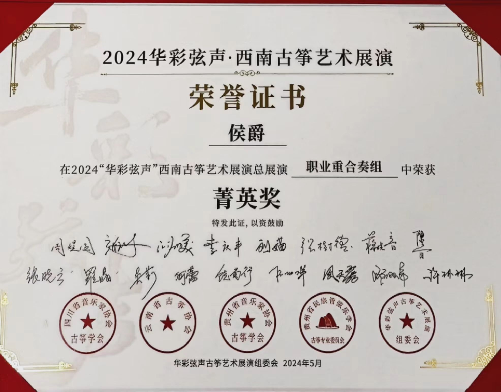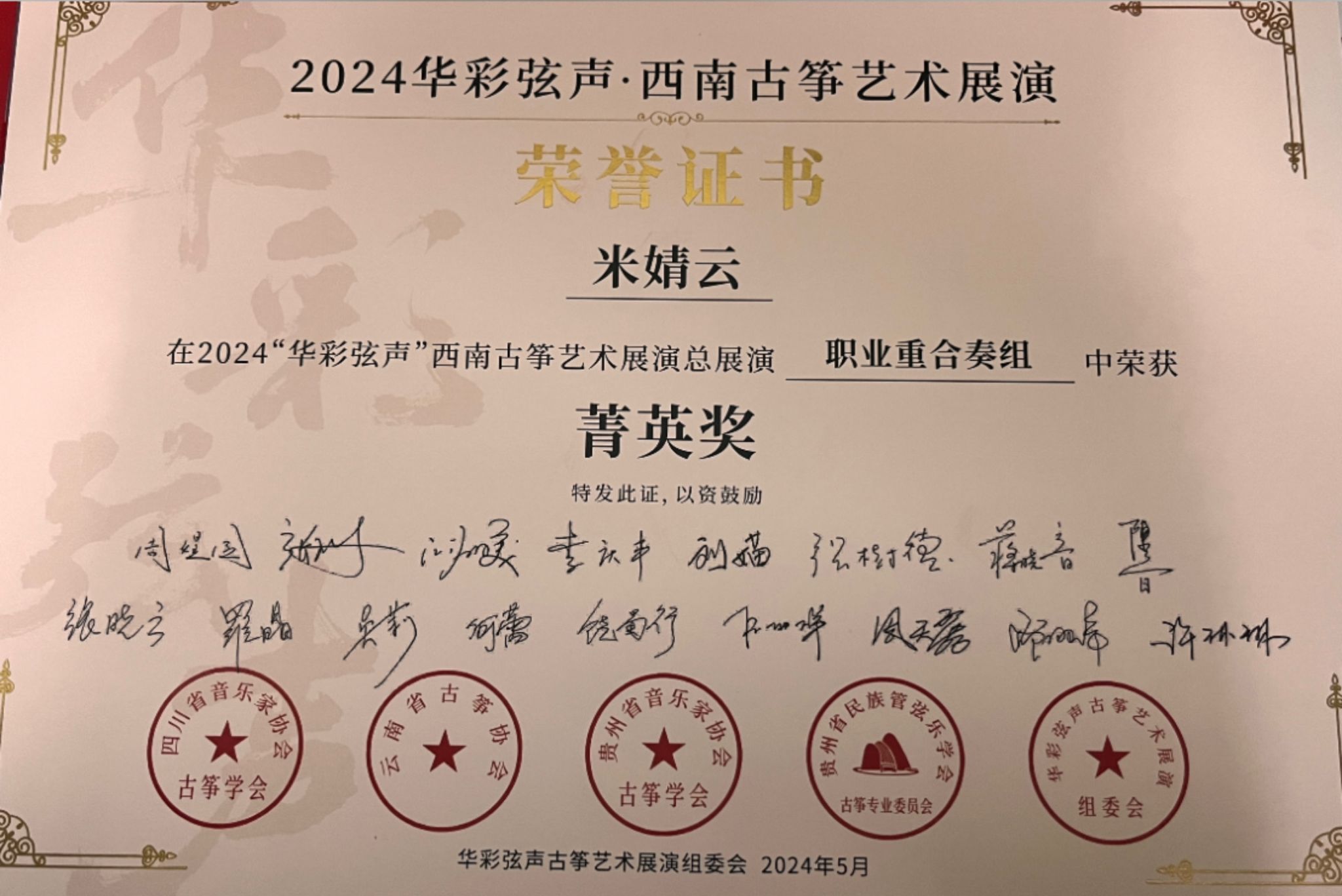 2024年5月1日至5日,由四川省音乐家协会指导,四川省音乐家协会古筝学会、云南省古筝协会、贵州民族管弦乐学会古筝专业委员会、贵州省音乐家协会古筝学会主办的“华彩弦声”第一届西南云贵川渝古筝艺术展演在四川ky开元集团官网入口举行。ky开元集团官网入口国乐系教师林恬、陈珂井指导的2023级学生侯爵、卢慧、米婧云荣获职业重合奏组菁英奖。