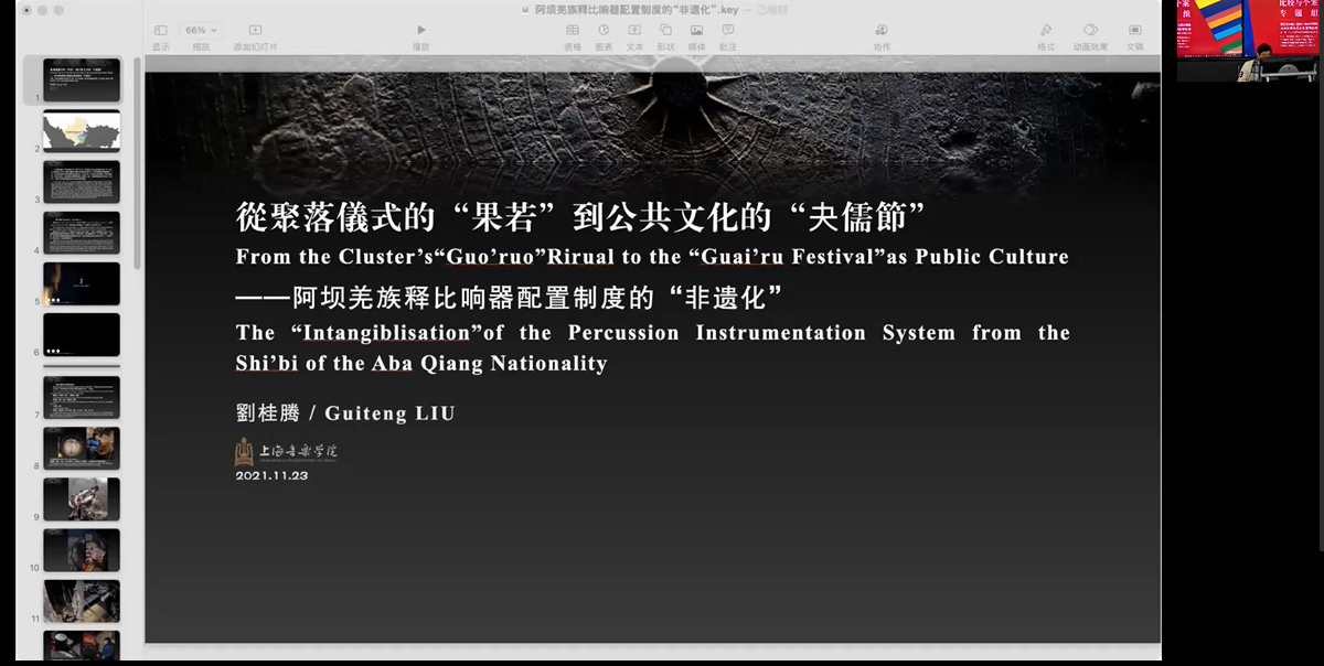 刘桂腾在《从聚落仪式的“果若”到公共文化的“夬儒节”--阿坝羌族释比响器配置制度的“非遗化”》发言中,提出中国非物质文化遗产保护运动中有两个极端的路向:主张传统的“遗产化”--执念于历史“遗留物”的本真性并将其当作传统文化保护的唯一对象/目标,因而忽视传统与时代变迁的关系;主张传统的“非遗化”--热衷于把那些利用传统文化元素创作出来的当代“建构品”打扮成“非遣”,因而混淆了非物质文化遗产“传”与“承”(葛剑雄)--保护与利用的关系。“非遗化”的产物,是当代人对传统文化遗产“利用”的结果而非“非遗”本身。“承”而不“传”,就是舍本求末。他认为正道是传、承并重,殊途同归--在"保存"的前提下"利用"。重"承"轻"传",必将付出丧失传统的代价。正确的道路是同时传授和继承,踏上通往同一目的地的不同道路,在"保存"的前提下"利用"。拿"继承"去争,忽视"传授",终将付出失去传统的代价。
