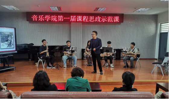 接着,李帅老师作了《萨克斯演奏》课程的示范教学,以贺绿汀创作的《铁道游击队》主题曲为教学内容,通过萨克斯重奏训练学生的合作能力,培养合作意识,同时引导学生感悟在中华民族的抗日斗争中,军民团结、不惧艰险、积极奋进的精神,进而激发学生爱国情怀,增强其文化自信与民族气概。