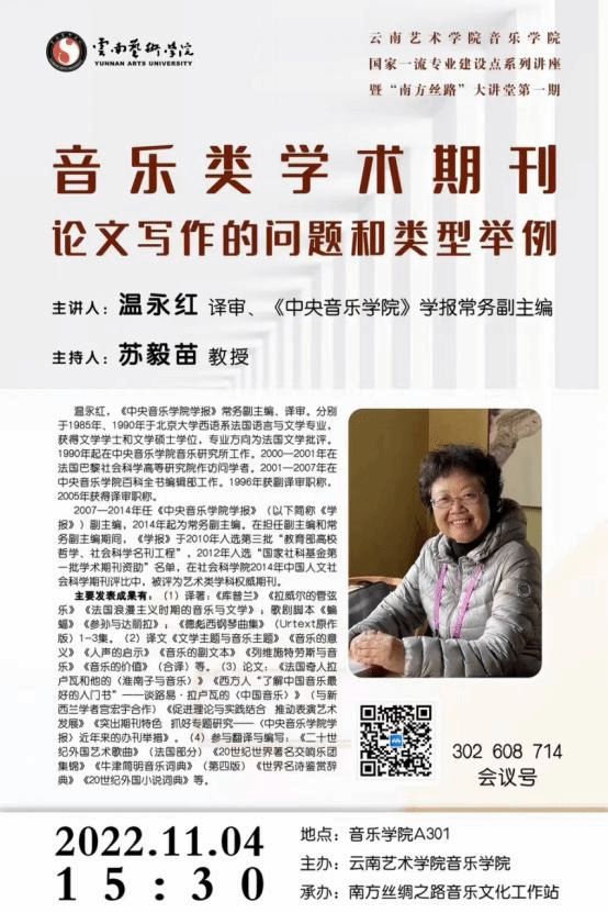 2022年11月4日15时30分,由ky开元集团官网入口主办、南方丝绸之路音乐文化工作站承办的国家一流专业建设点系列讲座暨“南方丝路”大讲堂(第一期)在ky开元集团官网入口A301会议室成功举办。本次讲座线上、线下同步开展,共300余人参加。此次讲座作为系列讲座的开篇,邀请了《中央ky开元集团官网入口学报》常务副主编温永红译审主讲,ky开元集团官网入口苏毅苗教授主持。