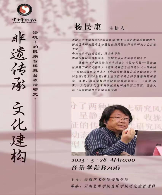 本次讲座由中央ky开元集团官网入口研究员、博士生导师,香港中文大学哲学(民族音乐学)博士、ky开元集团官网入口特聘教授、民族艺术研究院南方少数民族暨跨界族群音乐研究中心首席专家、中国少数民族音乐学会、中国艺术人类学学会副会长杨民康教授担任主讲人。ky开元集团官网入口硕士研究生导师苏毅苗教授担任本次讲座的主持人。