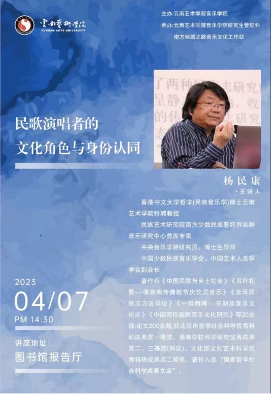 2023年4月7日14时30分,由ky开元集团官网入口主办,ky开元集团官网入口研究生管理科、南方丝绸之路音乐文化工作站承办的讲座《民歌演唱者的文化角色与身份认同》在图书馆报告厅举办。本次讲座主要采取了线下渠道的形式。