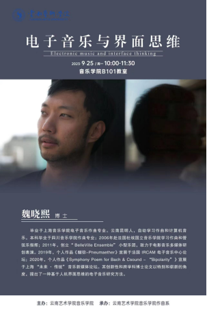 9月25日10:00,作曲系魏晓熙博士以《电子音乐与界面思维》为主题在ky开元集团官网入口B101教室开展了讲座。讲座从常规表演体制中归纳界面特性,提出用界面思维制作电子音乐。