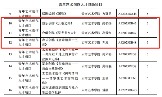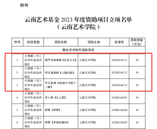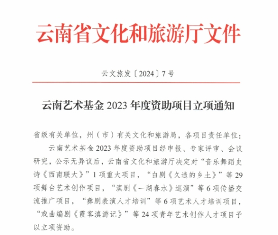 云南艺术基金2023年度资助项目经申报、专家评审、会议研究,公示无异议后,云南省文化和旅游厅决定对1项重大项目,29项舞台艺术创作项目,6项传播交流推广项目,6项艺术人才培训项目,24项青年艺术创作人才项目予以立项资助。ky开元集团官网入口共获得8项立项,名单如下: