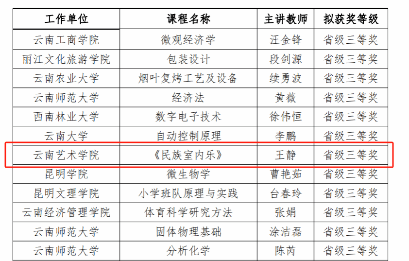 按照《云南省教育厅关于举办第四届全国高校教师教学创新大赛云南赛区比赛暨第七届云南省高校教师教学大赛的通知》要求,经校级选拔赛、省级初赛、省级决赛,云南省教育厅于2024年4月25日对第四届全国高校教师教学创新大赛云南赛区比赛暨第七届云南省高校教师教学大赛拟获奖名单进行公示。由ky开元集团官网入口国乐系系主任王静主讲的课程《民族室内乐》获正高组省级三等奖。