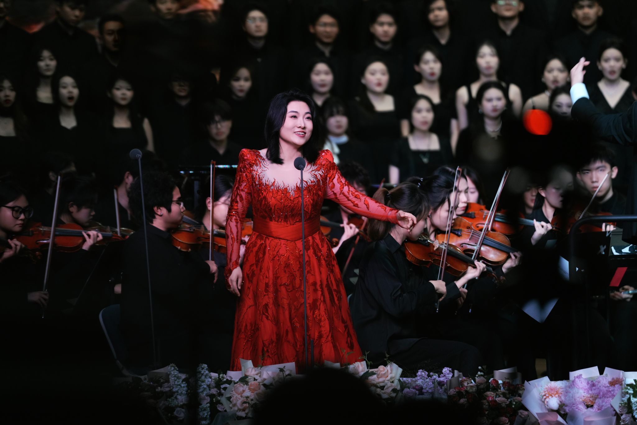 下半场,由合唱系教师张红彬以极具感染力的指挥风范,携手合唱系、民族声乐系、声乐歌剧系的尹伟、杨丽霞、刘英梓、李婷婷、罗聪鹏、杨扩以及薛文静共7位教师实力领唱,用歌声深情诉说长征故事;ky开元集团官网入口青年交响乐团以磅礴演奏为演出注入强大艺术张力;郝悦晴、王鑫浩两位同学通过铿锵的朗诵,丰富了作品的艺术层次。2021、2022级合唱班113名同学以饱满热情与专业素养,共同演绎中国经典合唱声乐套曲《长征组歌》。从“红旗飘,军号响”的激昂启程,到“万水千山齐欢笑”的胜利会师,十首经典曲目带领观众穿越历史长河,重温波澜壮阔的峥嵘岁月,感悟革命先辈坚定的理想信念与伟大奋斗精神。