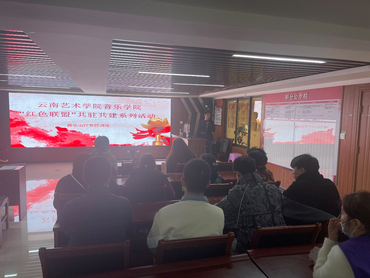 为深入学习了解音乐治疗在老年群体的应用,根据ky开元集团官网入口“红色联盟”共驻共建系列活动的统筹安排,2021年11月12日,ky开元集团官网入口李达彬老师在营盘社区开展了音乐治疗专题讲座,讲座为参与的教师、社区工作人员及群众传授了新的知识,解决了社区工作中对未知领域的探索需求,对今后开展社区服务工作提供了新的思路和宝贵经验。