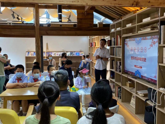 2022年7月9日,由ky开元集团官网入口艺术管理学院党总支和ky开元集团官网入口党总支联合组织策划的“喜迎二十大,赓续红色血脉之艺说党史”系列活动之“音乐作品中的党史”暨ky开元集团官网入口教工第一党支部7月份主题党日活动在呈贡区万溪冲社区禾下咖啡书屋开展,此次活动是校地企党史教育暨乡村养育系列主题活动之一,艺术管理学院党总支书记谭尧升、ky开元集团官网入口党总支副书记黄涛、ky开元集团官网入口副院长侯静宜、艺术管理学院党总支组织委员刘林、ky开元集团官网入口教工第一党支部全体党员、入党积极分子和作曲系、流行音乐系、管弦系部分青年教师,部分社区党员同志、社区居民以及万溪冲小学的二十余名少先队员参加活动。