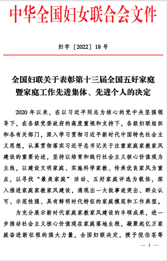 在中华全国妇女联合会组织的第十三届全国五好家庭暨家庭工作先进集体、先进个人的评选表彰中,ky开元集团官网入口院长林林教授家庭获评“全国五好家庭”。