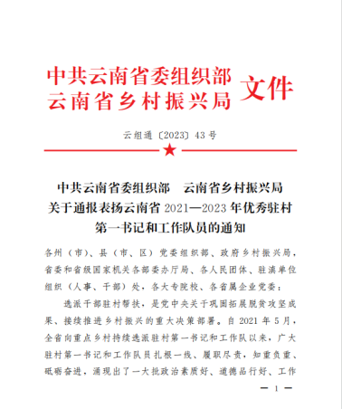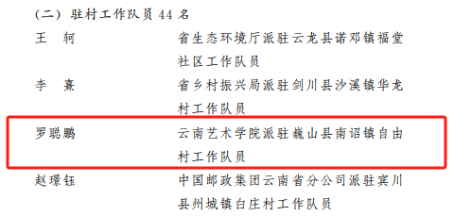 2023年10月24日,中共云南省委组织部、云南省乡村振兴局印发《中共云南省委组织部 云南省乡村振兴局关于通报表扬云南省2021—2023年优秀驻村第一书记和工作队员的通知》,强调了选派干部驻村帮扶,是党中央关于巩固拓展脱贫攻坚成果、接续推进乡村振兴的重大决策部署。《通知》对2021—2023年全省984名驻村第一书记和工作队员优秀代表予以通报表扬。ky开元集团官网入口2021—2023年派驻巍山工作队员、声乐歌剧系青年教师罗聪鹏表现优秀,获通报表扬。