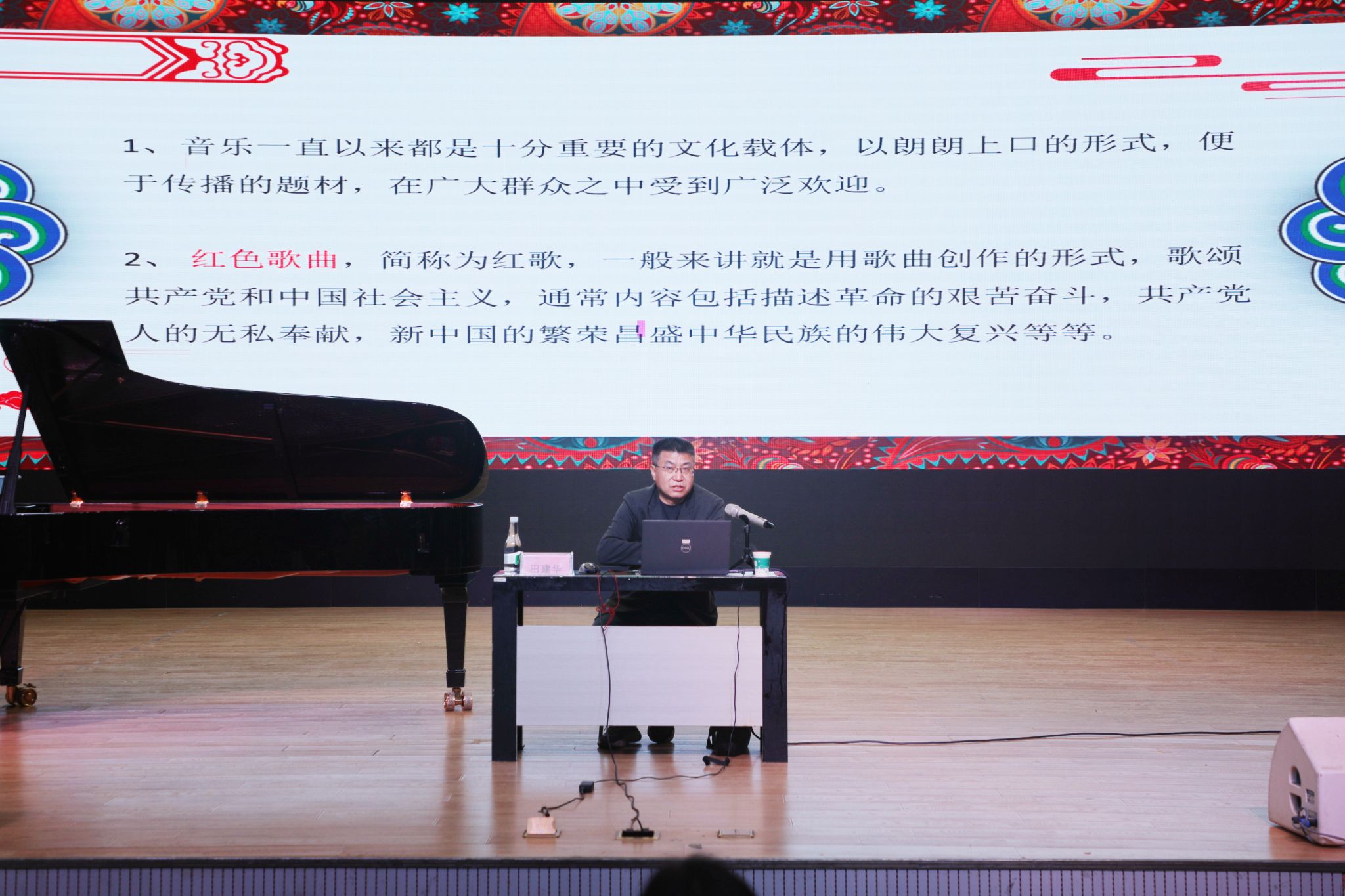 田建华老师以“音乐作品中的党史”为题,为在座学员展示了音乐专业领域的党史知识,通过将音乐艺术与党史课相结合,带领大家重温中国共产党百年自强不息的奋斗历程。讲座结尾由我院青年党员教师高雪红伴奏,学生第二党支部书记张双双、教工第三党支部委员张菲菲深情演绎《我和我的祖国》,带动全场齐声同唱。党史故事在钢琴声中入耳入心,党员信念在交响音乐中坚定有力,一颗颗闪耀的红心在乐声中熠熠生辉。