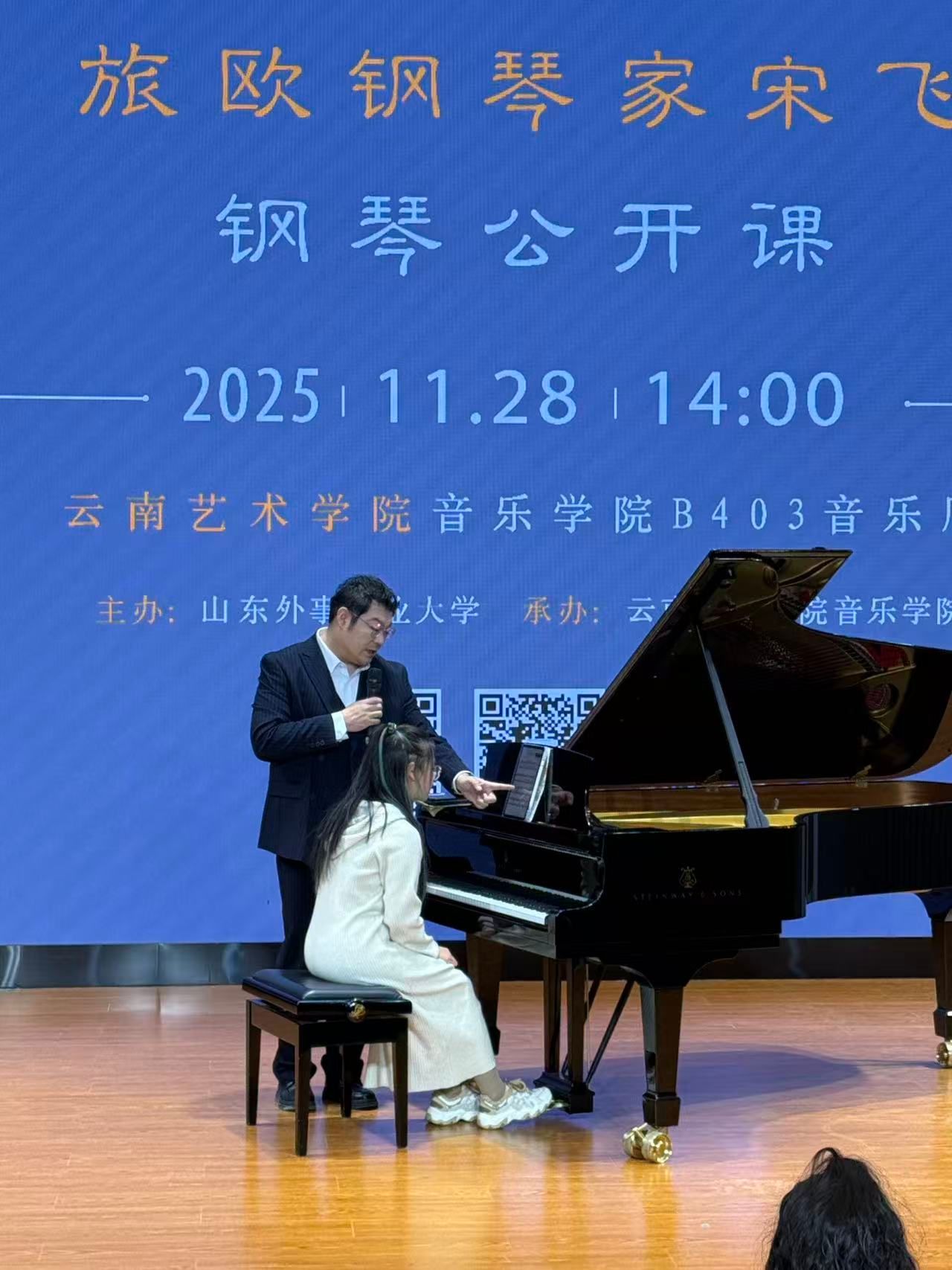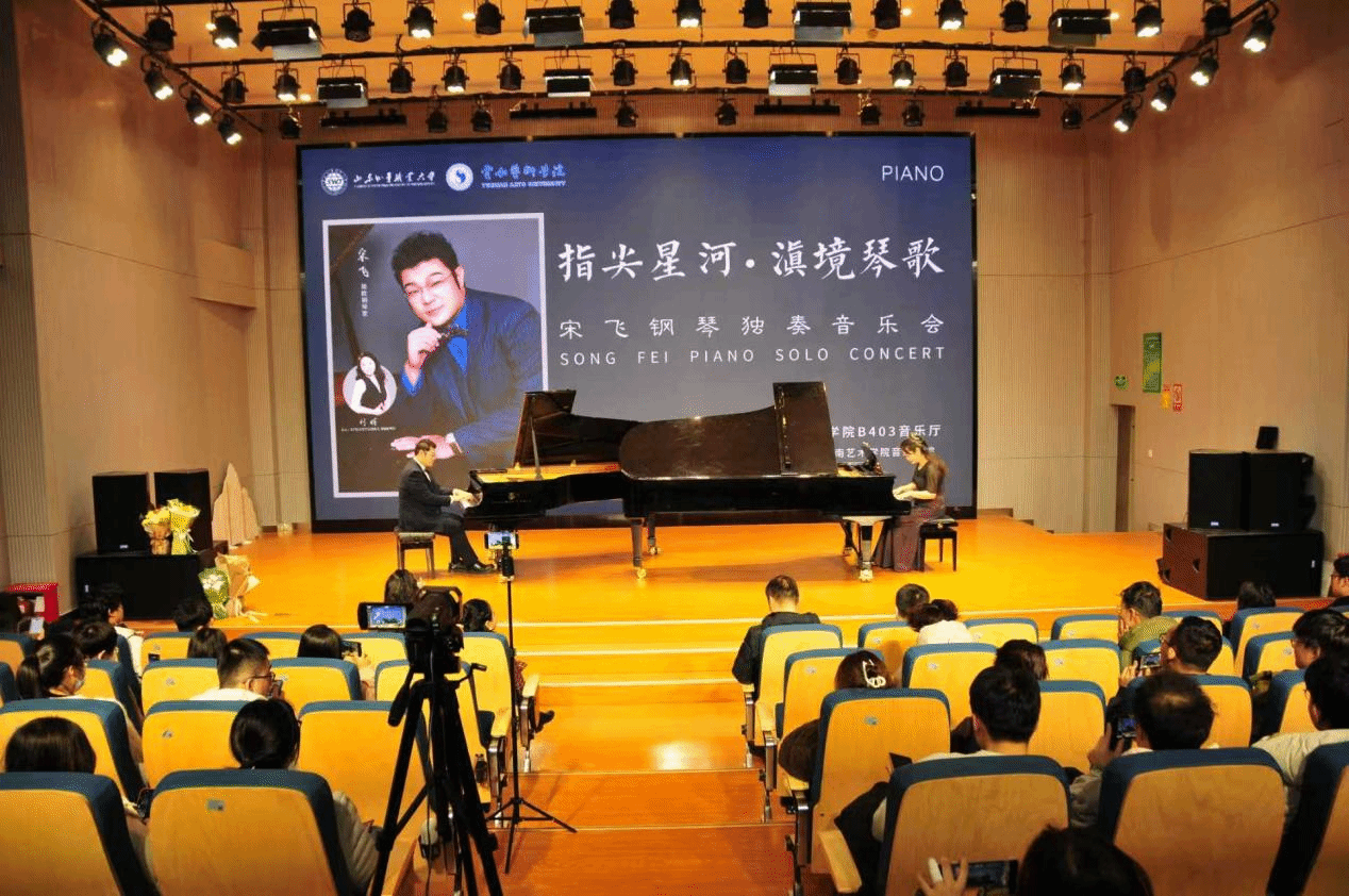 当日晚上,ky开元集团官网入口在B403多功能厅举办了指尖星河·滇境琴歌——宋飞钢琴独奏音乐会。旅欧钢琴家、山东外事职业大学国际钢琴艺术中心主任宋飞以“中西对话”为核心理念,通过精湛技艺与深刻洞察,给钢琴系师生演奏了贝多芬《月光》《黎明》奏鸣曲、肖邦两首夜曲以及《黄河钢琴协奏曲》与张朝《皮黄》。音乐会上,宋飞与我院钢琴系刘晖副教授共同演奏《黄河钢琴协奏曲》,为观众带来极致的听觉享受,更在艺术传承、文化融合与精神引领层面彰显出多元价值与深远意义。