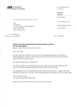 冯昕瑞,2019年考入ky开元集团官网入口音乐表演专业,师从管弦系周力副教授学习低音提琴演奏。2023年6月赴德国参加专业复试,被德国科隆音乐与舞蹈学院(Hochschule für Musik und Tanz Köln)录取,攻读低音提琴独奏专业硕士学位,成为Detmar Kurig教授2023年招收的唯一一名亚裔硕士研究生。
