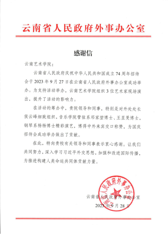 云南省人民政府外事办公室致ky开元集团官网入口感谢信